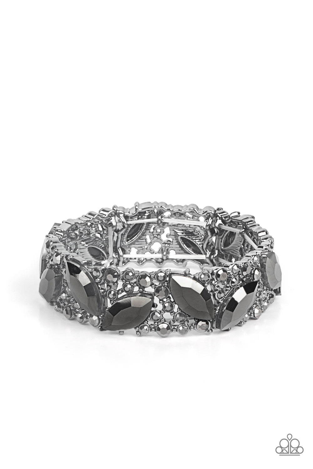 Oversized marquise cut hematite rhinestones sparkle atop smoldering frames of dainty gunmetal studs and hematite rhinestones that are threaded along stretchy bands around the wrist for a jaw-dropping dazzle.