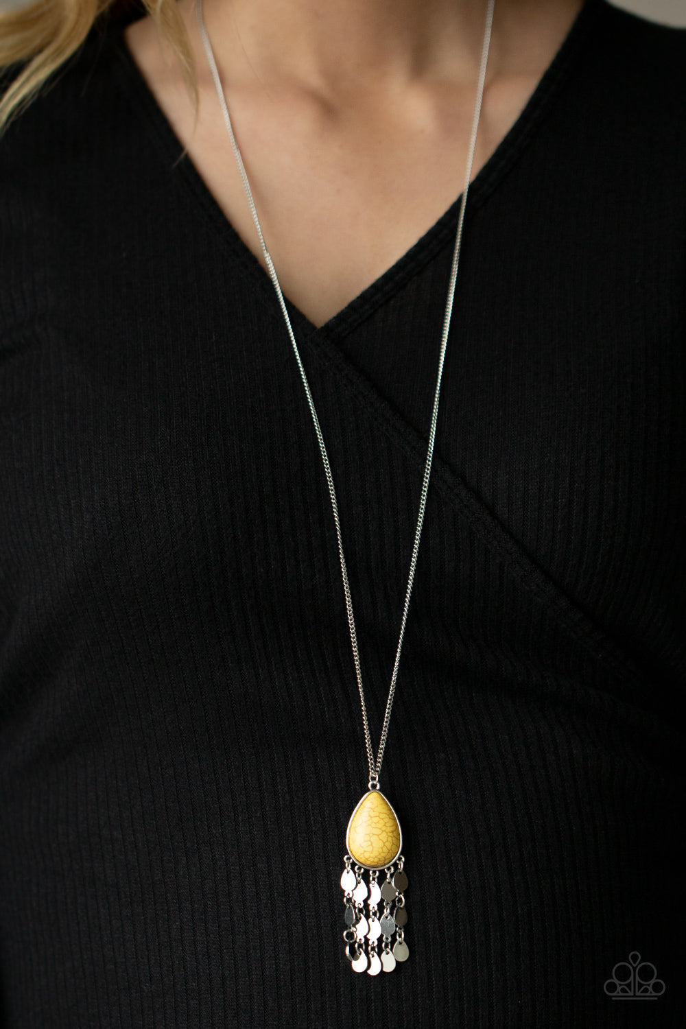 A sunny yellow stone teardrop pendant swings from the bottom of a lengthened silver chain. Tassels of silver teardrop frames trickle from the bottom of the colorful pendant, creating a musical fringe. Features an adjustable clasp closure.
