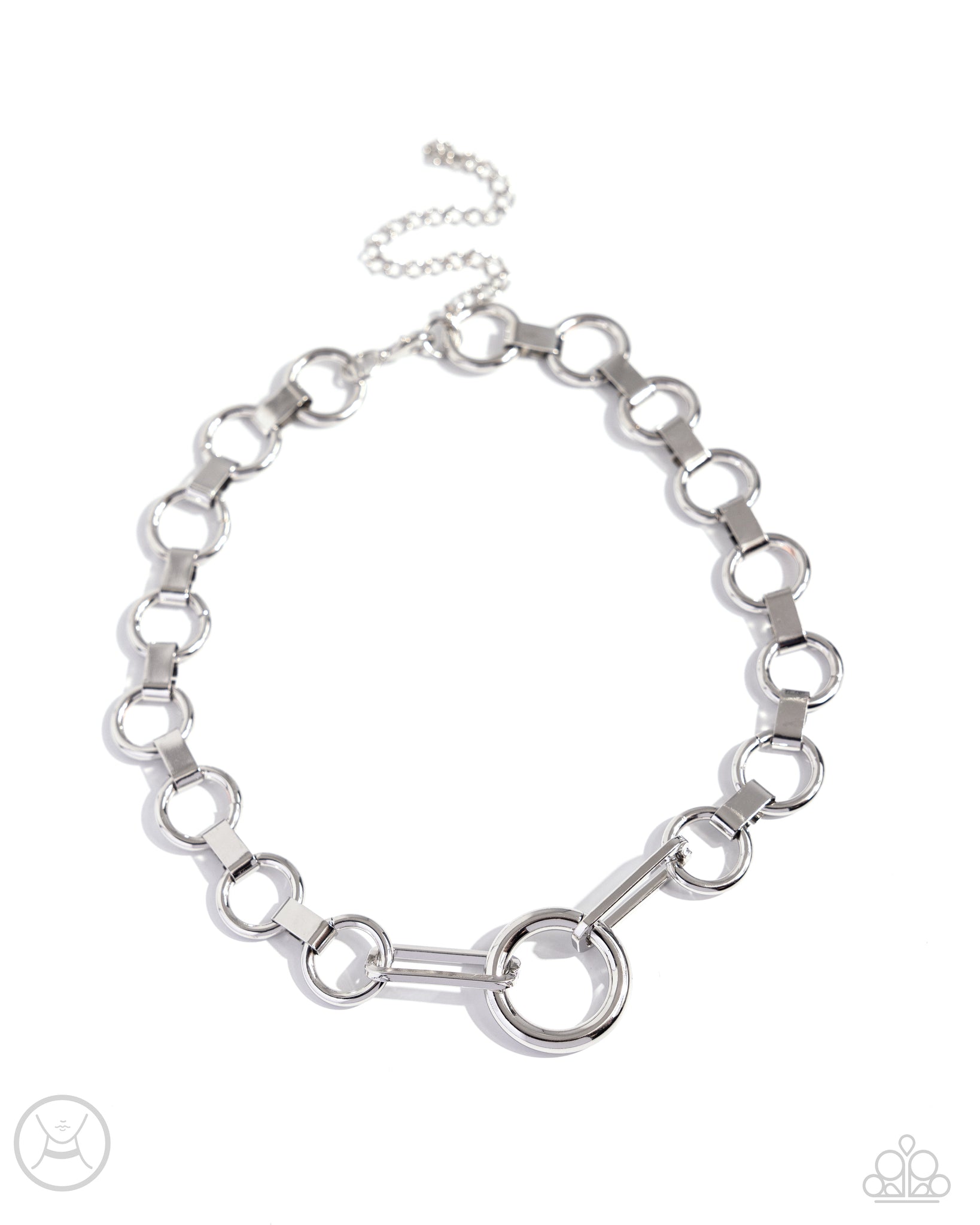 Glistening silver clasps and hoops are interlocked together as they encircle the collar for a dynamic display. Featured in the center, an oversized silver hoop and elongated silver rings create a standout streamlined statement. Features an adjustable clasp closure.