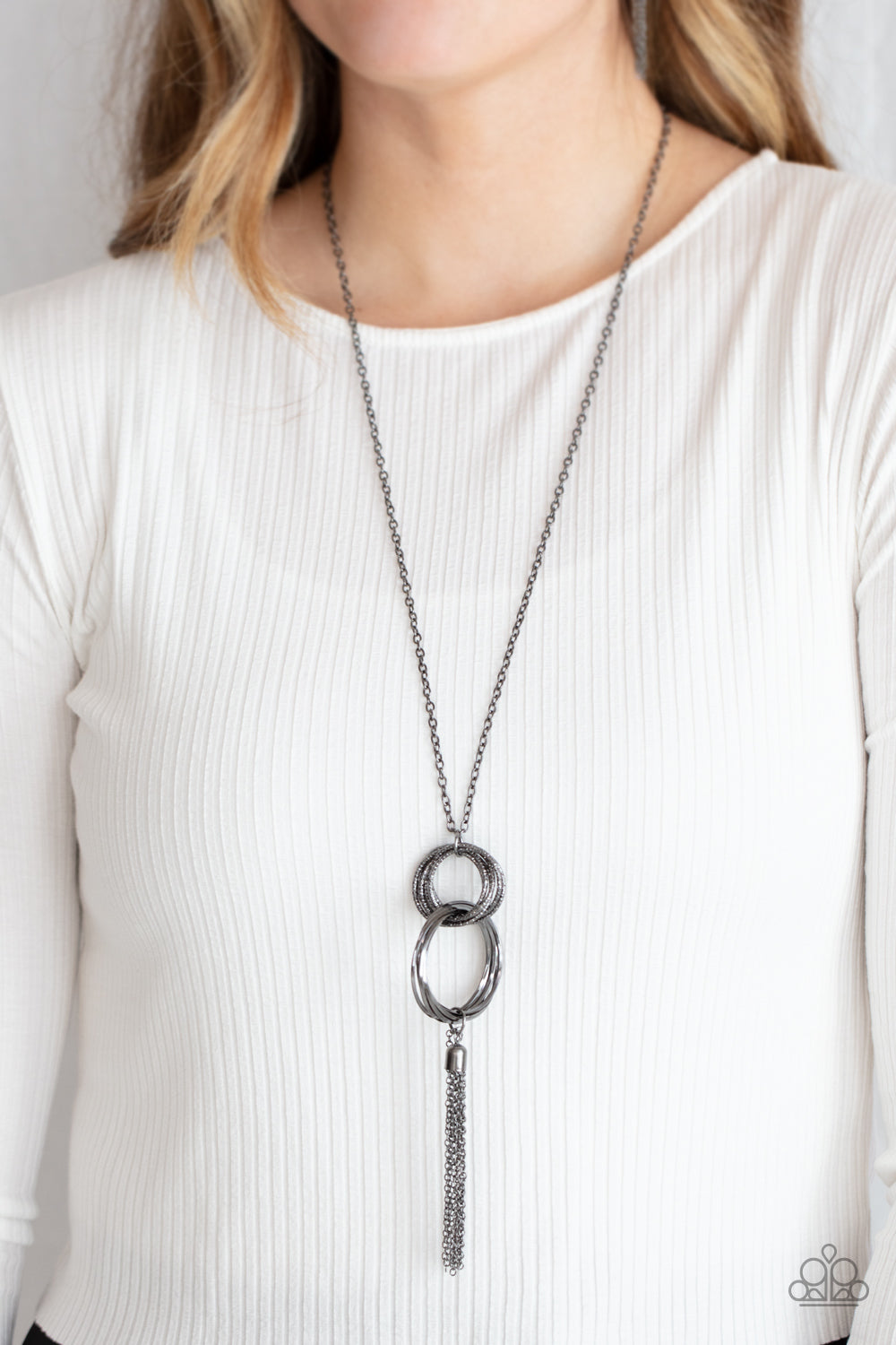 A collection of shimmery cross-cut gunmetal hoops and larger smooth hoops link together in a striking out-of-this-world display. A gunmetal tassel sways from the bottom of the lengthened necklace for an extra show of splendor. Features an adjustable clasp closure.