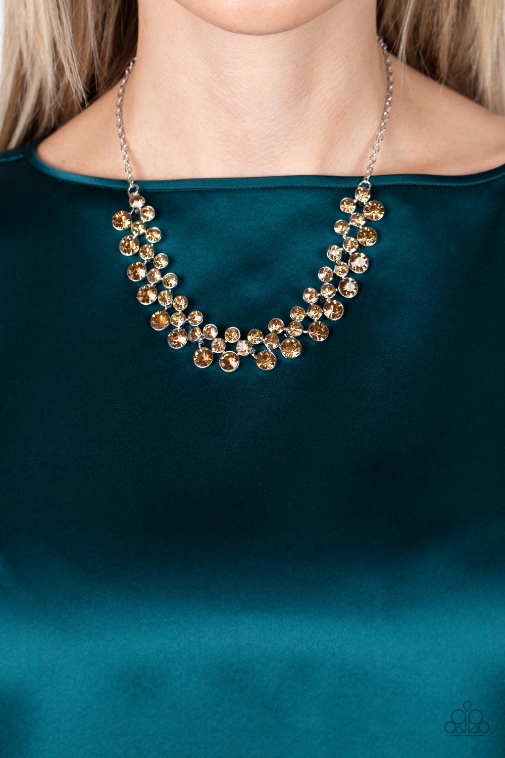Encased in sleek silver frames, staggered rows of bubbly golden topaz rhinestones effervescently link below the collar for a glamorous pop of sparkle. Features an adjustable clasp closure.